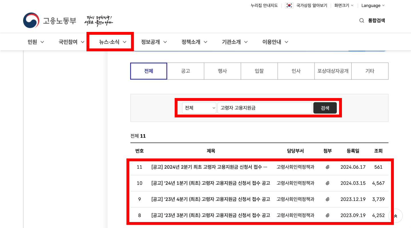 고용노동부 > 뉴스 소식 > 고령자 고용지원금 검색