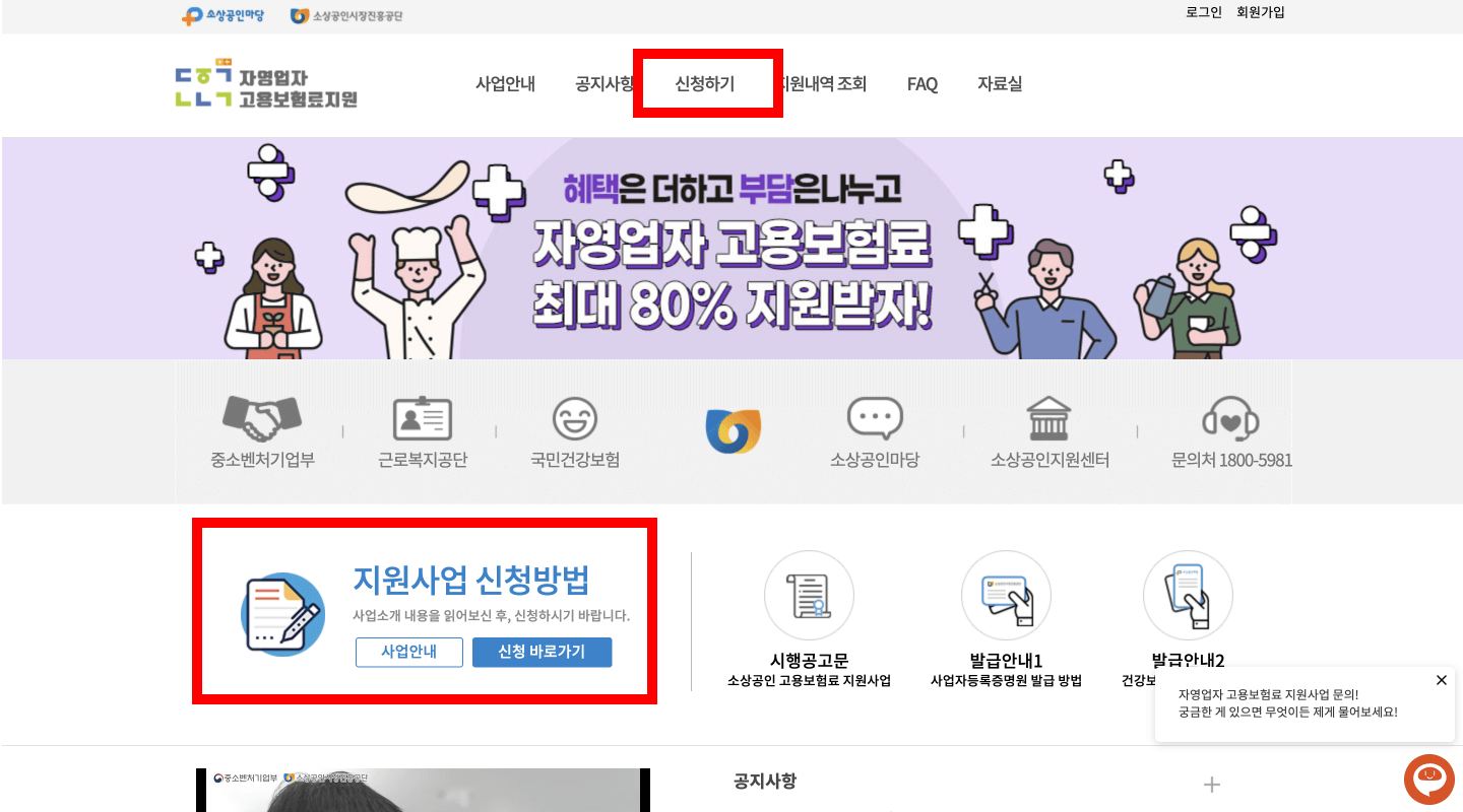 자영업자 고용보험료지원 홈페이지 https://www.sbiz.or.kr/eip/main/main.do