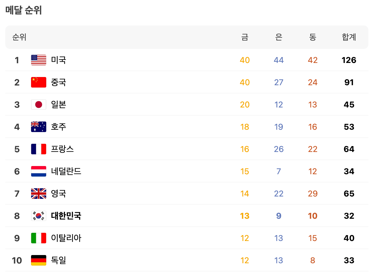 이번 2024 파리 올림픽에서 한국 선수들은 금메달 13개, 은메달 9개, 동메달 10개를 획득하며 종합 8위를 기록했습니다. 특히 양궁에서는 김우진 선수가 세 종목에서 금메달을 차지하며 한국 올림픽 역사에 새로운 장을 열었습니다. 또한, 근대5종에서는 성승민 선수가 아시아 선수 최초로 동메달을 획득하는 쾌거를 이뤘습니다.